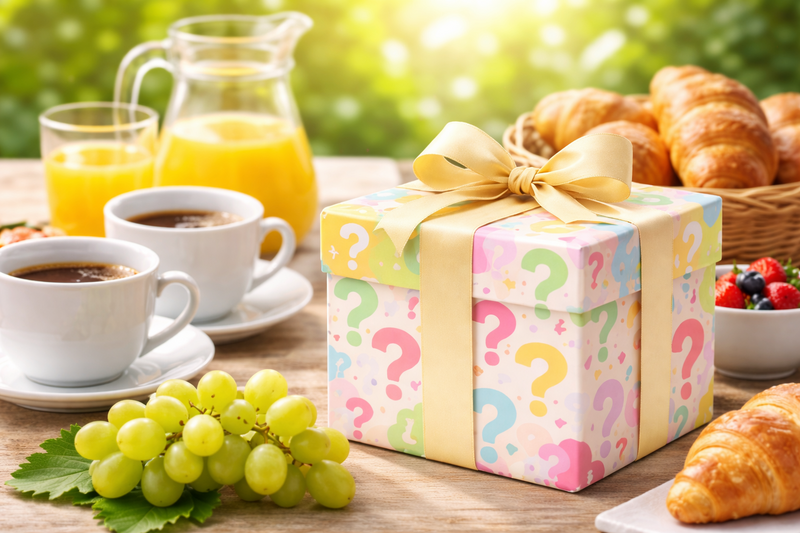 Frühstückstisch im Sonnenlicht mit Kaffee, Orangensaft, Croissants, Trauben und einer Geschenkbox mit Schleife und bunten Fragezeichen – ein Bild für Entdeckungen und geschenkten Glauben beim Bibel-Brunch in Mascherode.