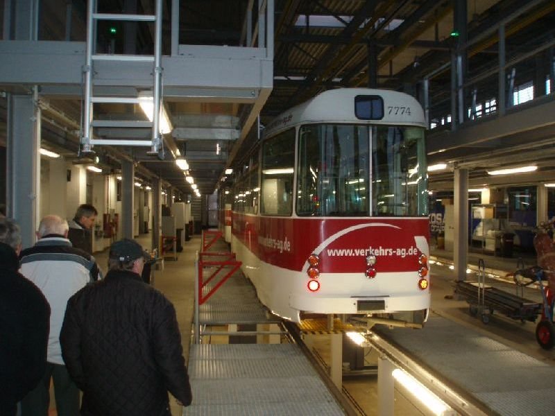 Er zeigte uns die Aufteilung der Werkstätten und erläuterte uns die Innovationen der Verkehrs-AG anhand der selbst entwickelten Technik für blinde Fahrgäste.